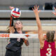 “This was a battle of exchanging points and who could make the least amount of mistakes,” said Coach Alise Bowles. “Set 1 we went up 12-8 with sophomore Aftyn Hurst ( L) at the service line.