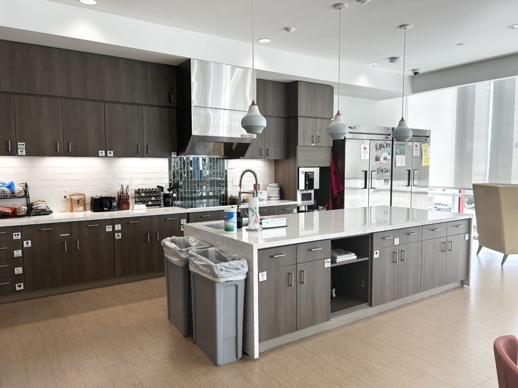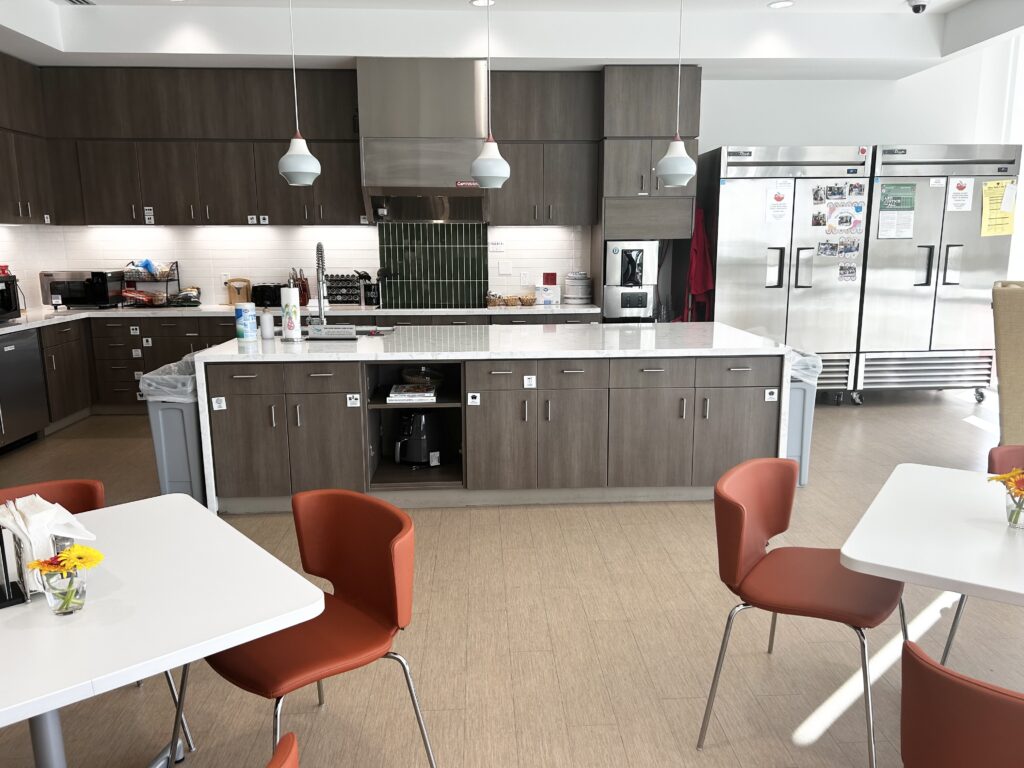 -Four overnight sleep rooms for short-term stays, scheduled by hospital social workers. – Kitchen and dining areas stocked with quick-to-make meals and snacks. – Laundry and showers with toiletries on hand. – Comfortable living spaces and quiet rooms to make calls or meet with staff. – Guest computers with printer and fax access.