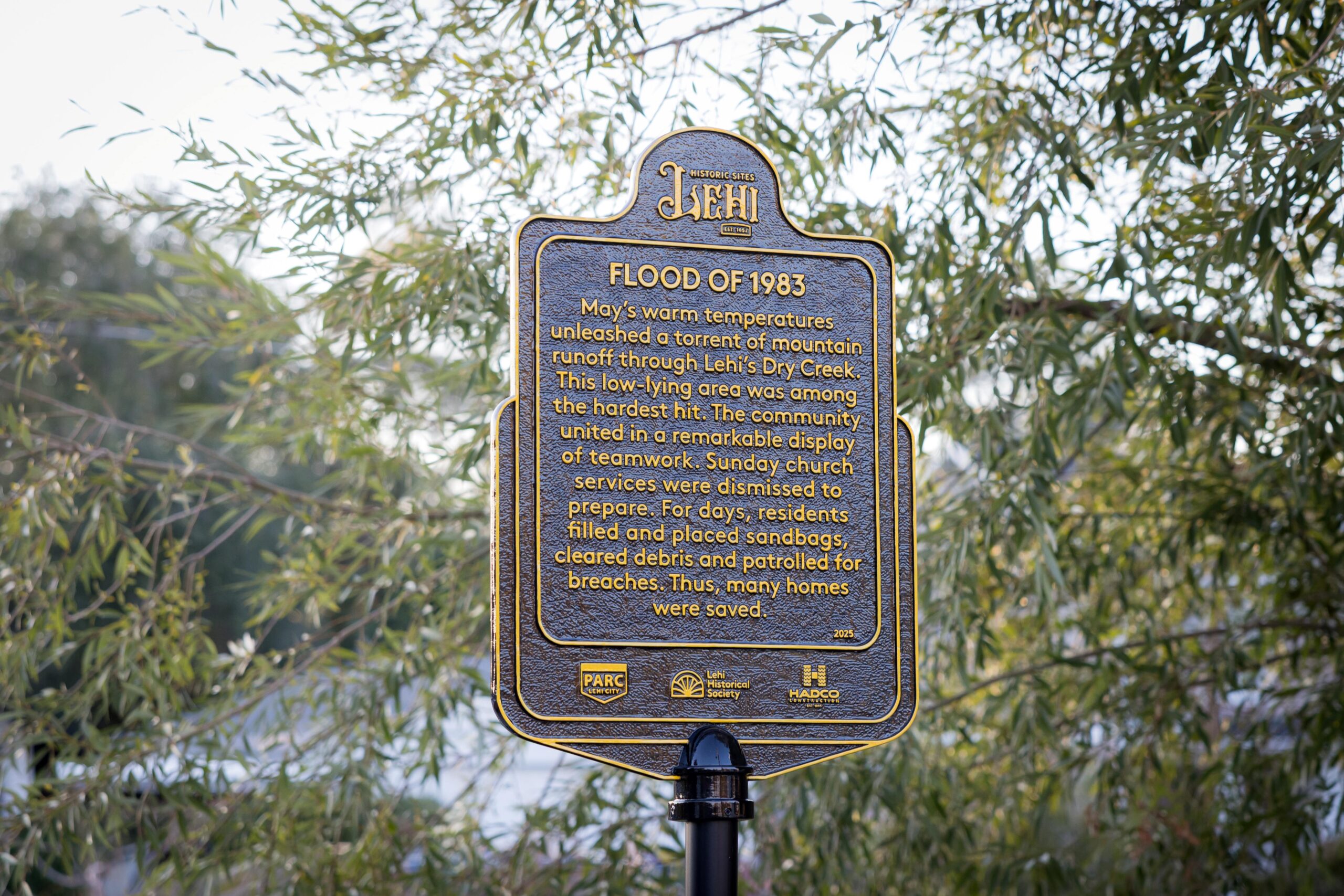 In 1983, over Memorial Day weekend, a combination of record snowfall, saturated grounds, warm rains, and temperatures in the 90s produced disastrous flooding throughout the Wasatch Front. Because of the way the Lehi community came together, damage was reduced, and no homes were lost. The marker is located in one of the hardest-hit areas. The marker is the last to be installed this year.