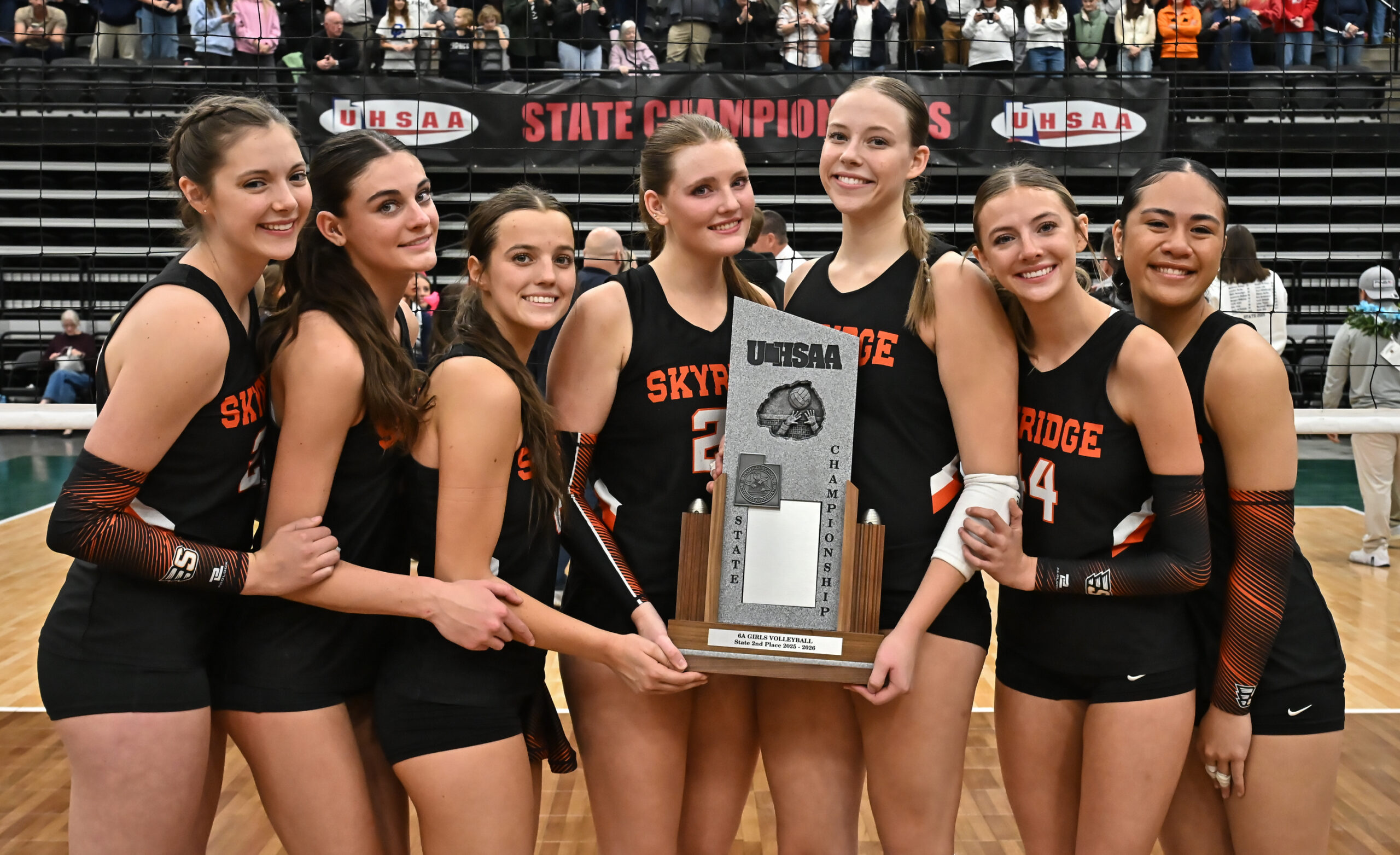 The No. 1 Skyridge girls volleyball team secured a second-place finish for the silver trophy in a hard-fought match in the 6A state championship tournament on Thursday (Oct. 30) at the Utah Valley University UCCU Center, falling to No. 2 Corner Canyon in four sets.