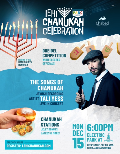 The evening will feature a variety of activities meant to engage families and children, including: lighting the Utah County Menorah and a dreidel competition with participation from local elected officials, live music with Jewish recording artist Tali Yess, and Chanukah stations offering traditional holiday treats.