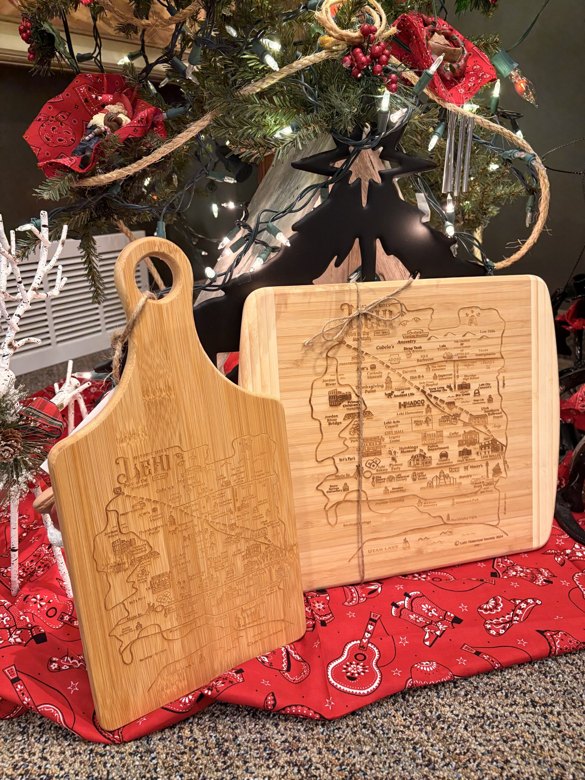 This year’s Christmas gift offerings at the Lehi Historical Society include the historical marker and Lehi Heritage Day enamel pins, a 2026 calendar, cutting boards featuring a map of Lehi and its significant locations, a Lehi baseball cap, and a “There’s no place like home: Lehi” Christmas ornament.
