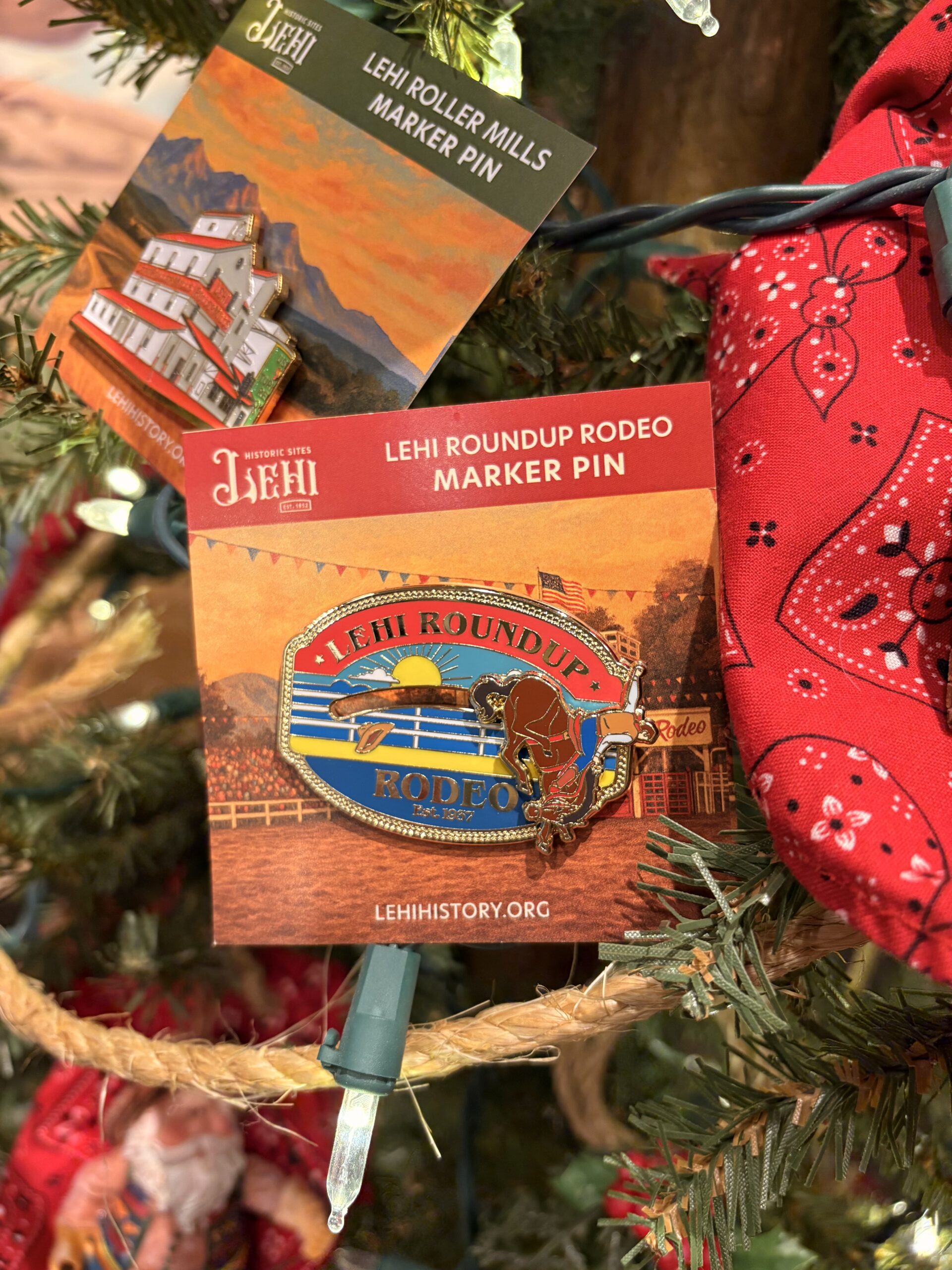 The Lehi Historical Marker enamel lapel pins for markers unveiled in 2024 and 2025 are among the most popular items ever offered in the historical society’s gift shop. Lehi City Councilmember Heather Newall designed a pin for each historical marker, and she collaborated with Lehi artist Stanley Wanlass for the Heritage Day 2025 pin. The price range for the pins is $8 to $15, including a three-pin set for the Veteran’s Memorial Building for $15.